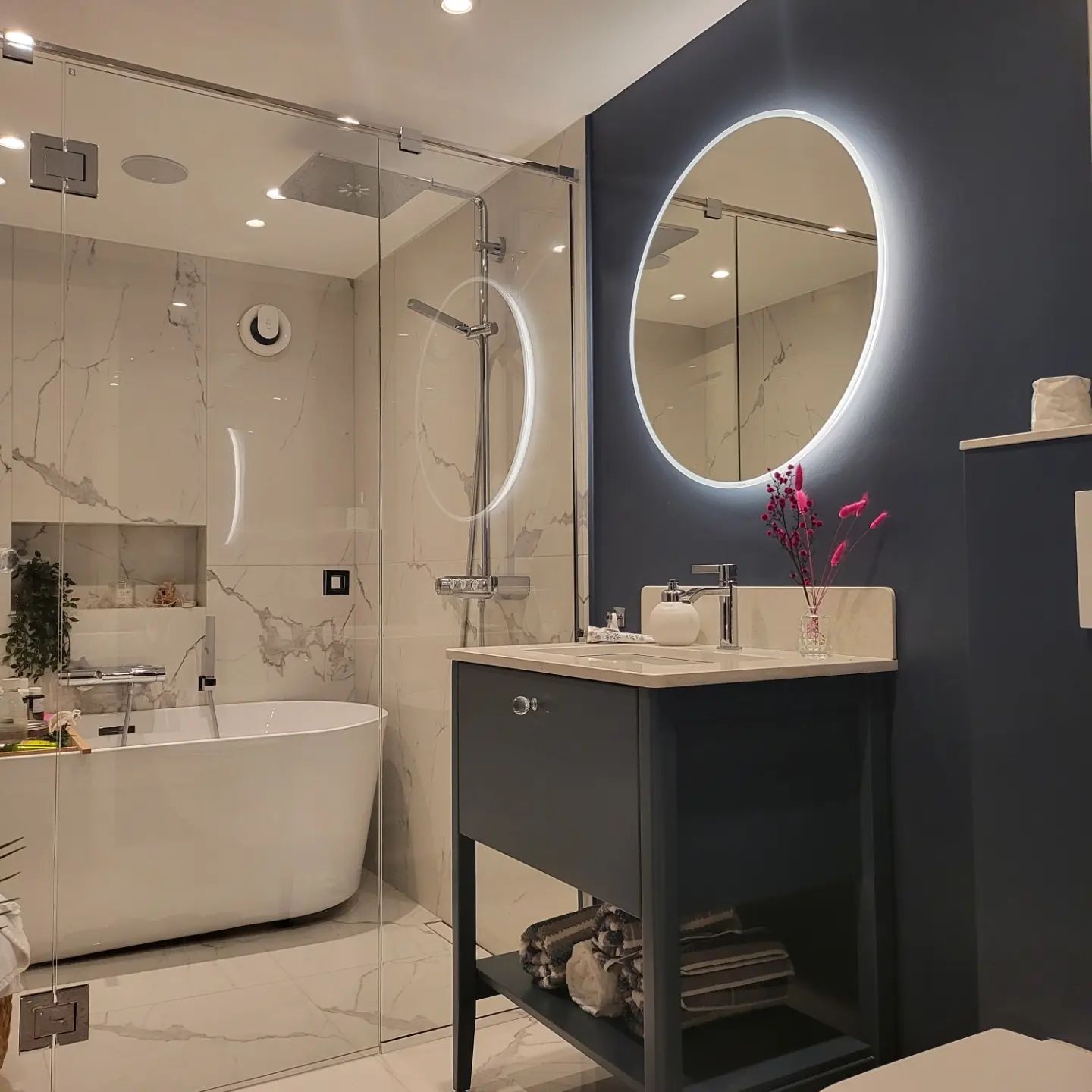 Spesielt bad med marmur fliser og slette vegger i en enebolig