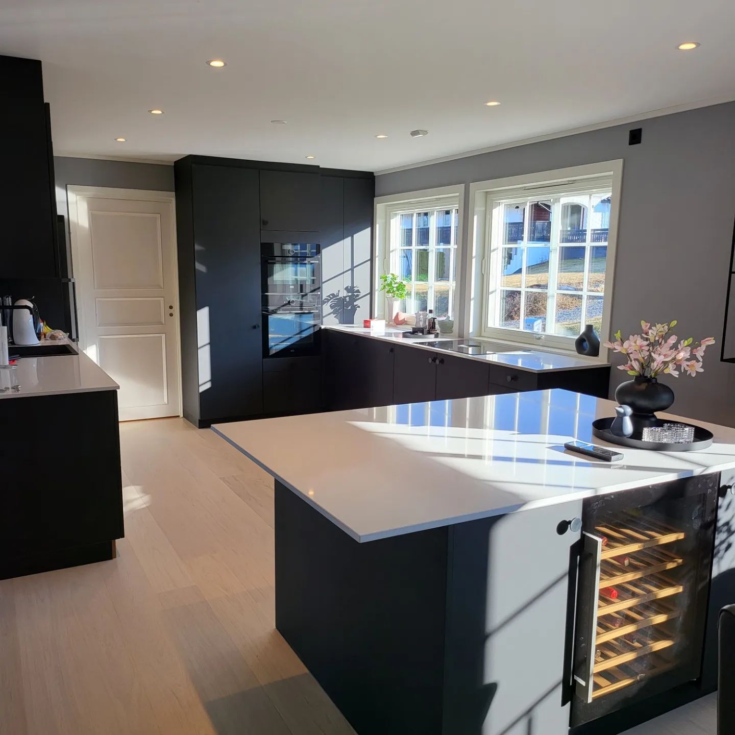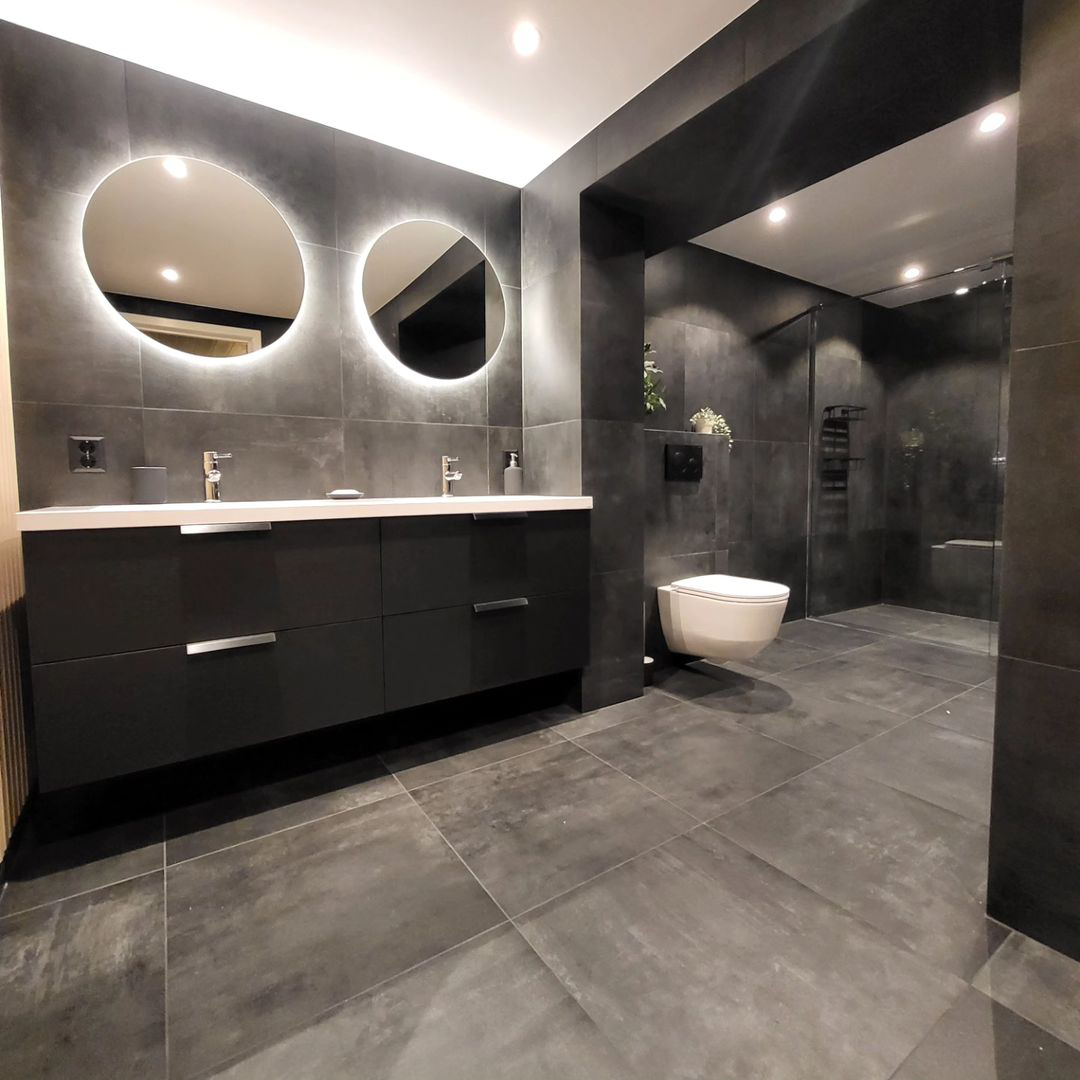 Bad med svart utstyr og fine fliser i en enebolig